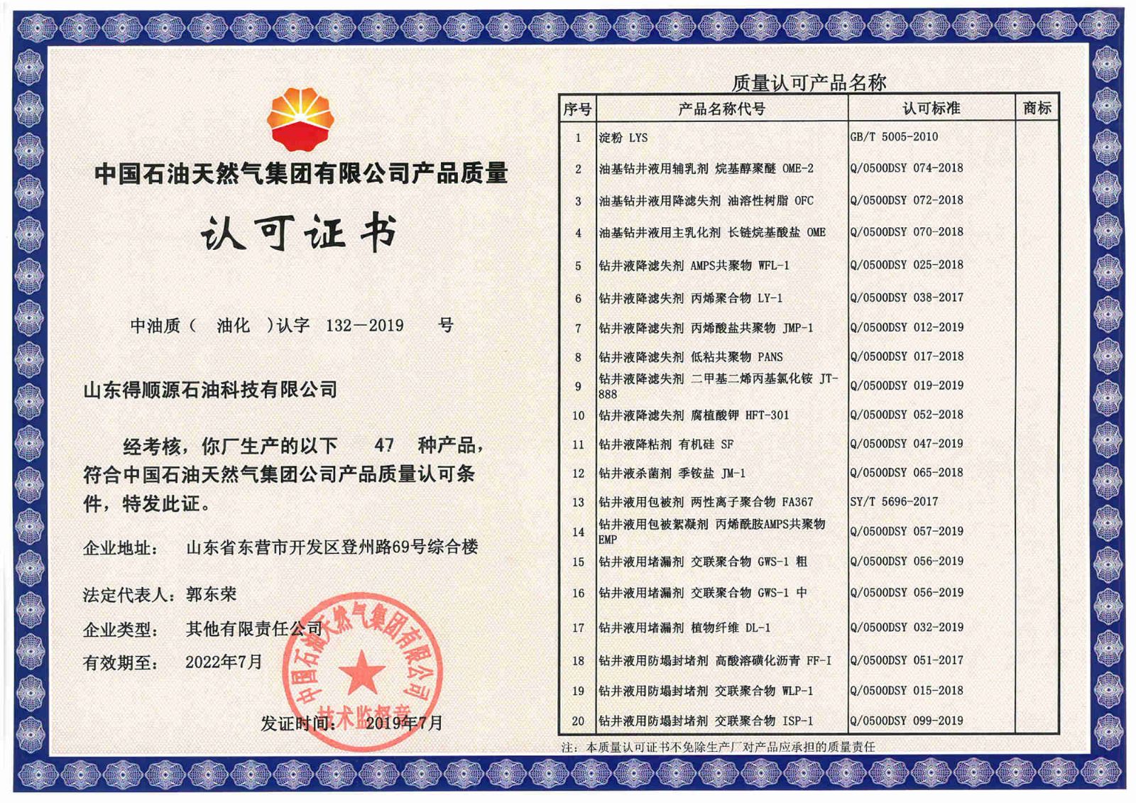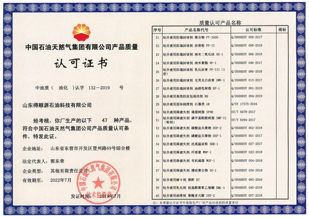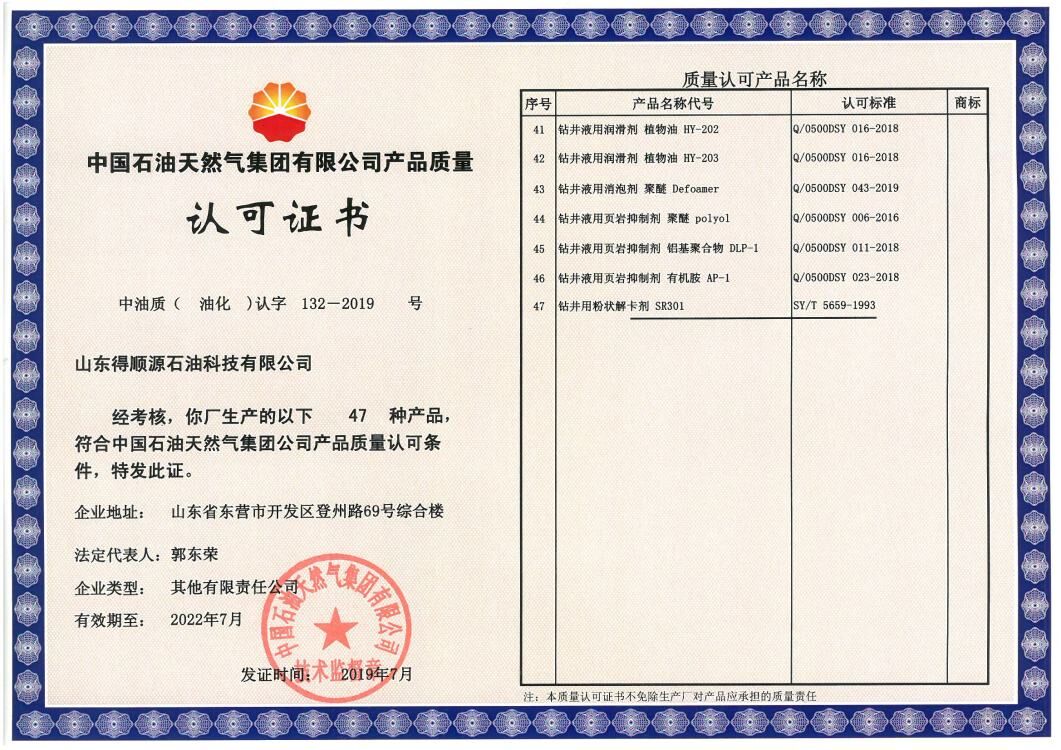 On July 18, 2019, Shandong Deshunyuan Petroleum Sci & Tech Co., Ltd has passed the renewal review of PetroChina Product Quality Accreditation and obtained the new certificate. There are 3 new accredited products : high temperature resistant starch SHR-1, nano-silica NS-1 and detergent RH. The addition of the 3 new products increases the number of accredited products to 47.