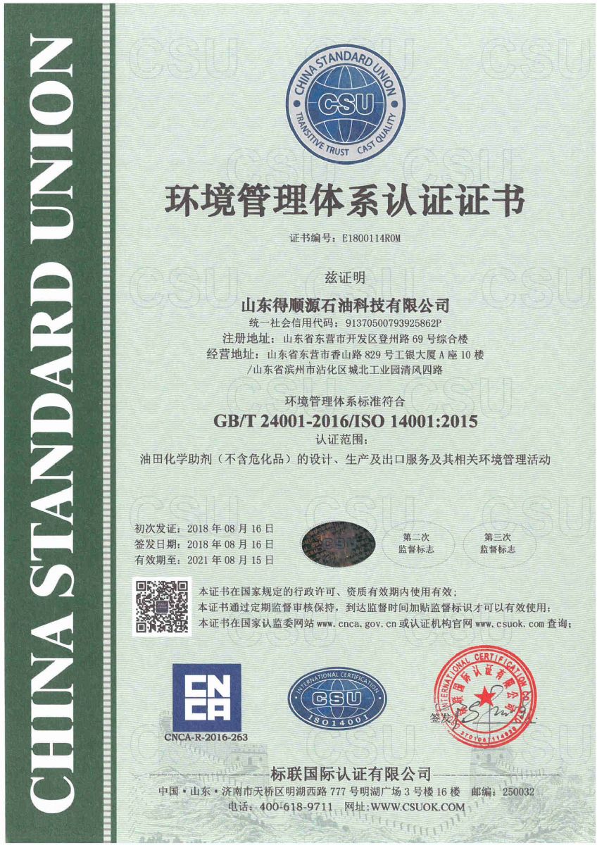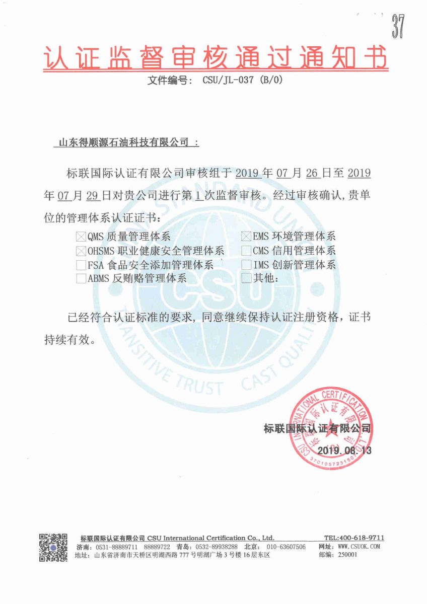 2019年8月19日,公司接到標聯國際認證有限公司通知,順利通過了質量管理體系、環境管理體系和職業健康安全管理體系認證的第一次監督審核,符合認證標準的要求,繼續保持認證注冊資格,證書持續有效。