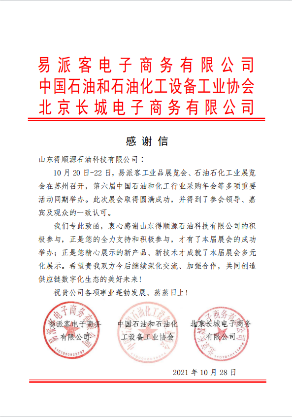 2021年10月20日,2021易派客工業品展覽會暨石油石化工業展覽會在蘇州國際博覽中心開幕。這是目前國內首個石油、煉油與化工行業泛工業品綜合展會。中石化集團公司副總經理劉宏斌、李永林出席開幕式并致辭,江蘇省副省長胡廣杰出席。山東得順源石油科技有限公司受邀參加“易派客主題論壇暨戰略合作簽約儀式”、“易派客平臺核心關聯方座談會”和“油田化學劑專家論壇”等核心論壇。開幕式后孫衛東副總經理陪同中石化和江蘇省領導巡展各專業化展區。在“易派客主題論壇暨戰略合作簽約儀式”上孫衛東副總經理代表公司簽署《易派客平臺戰略合作協議》,成為鉆井液助劑行業唯一戰略合作單位。